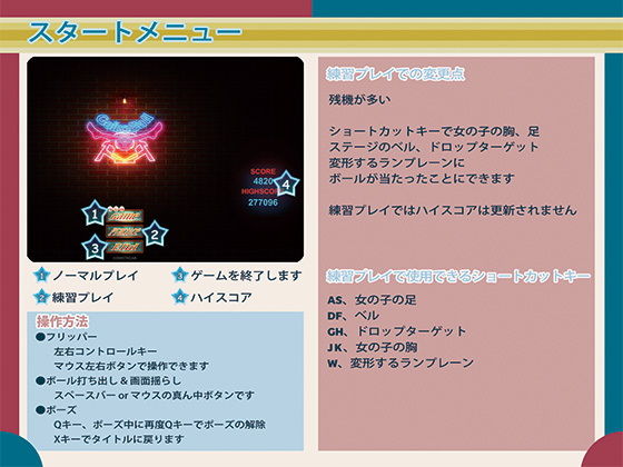 スタート選択、ボールの打ち出し、画面の揺らしはスペースバーに割り当てられております
