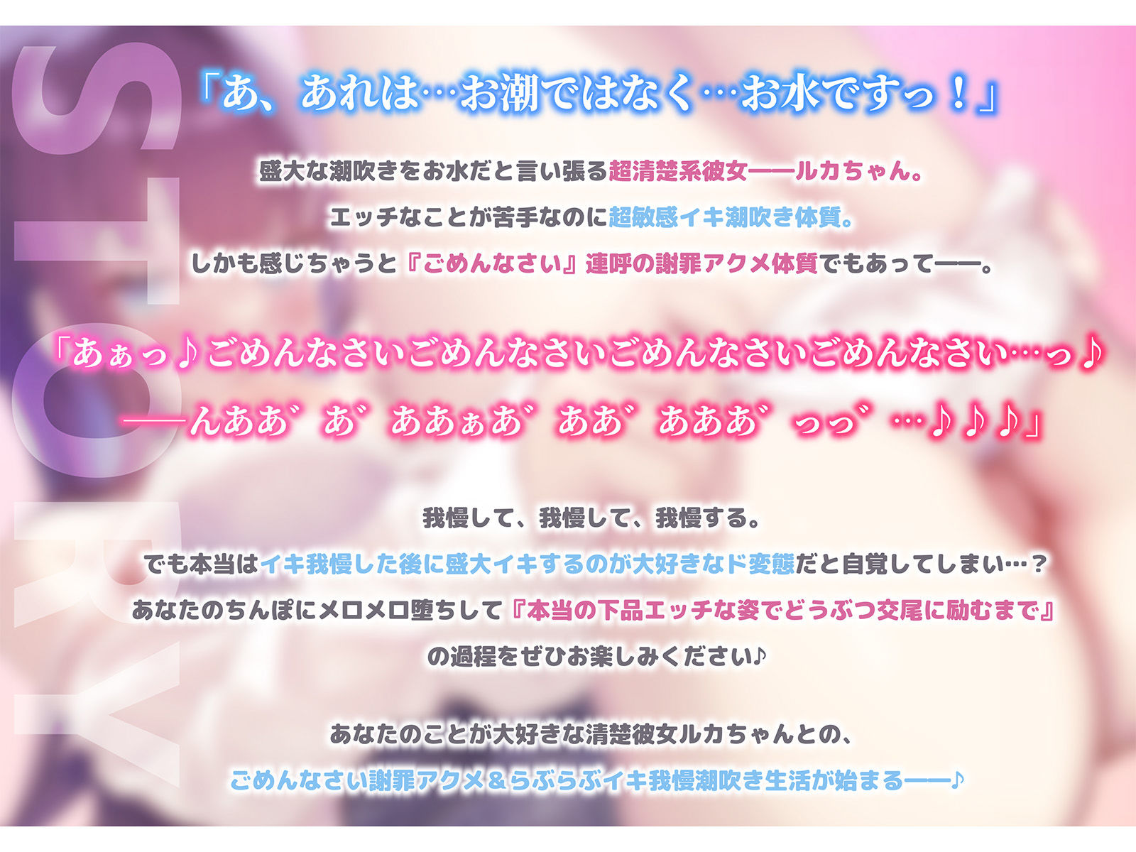 盛大な潮吹きをお水だと言い張る超清楚系彼女――ルカちゃん。エッチなことが苦手なのに超敏感イキ潮吹き体質。しかも感じちゃうと『ごめんなさい』連呼の謝罪アクメ体質でもあって――。あなたのことが大好きな清楚彼女ルカちゃんとの、ごめんなさい謝罪アクメ&らぶらぶイキ我慢潮吹き生活が始まる――♪