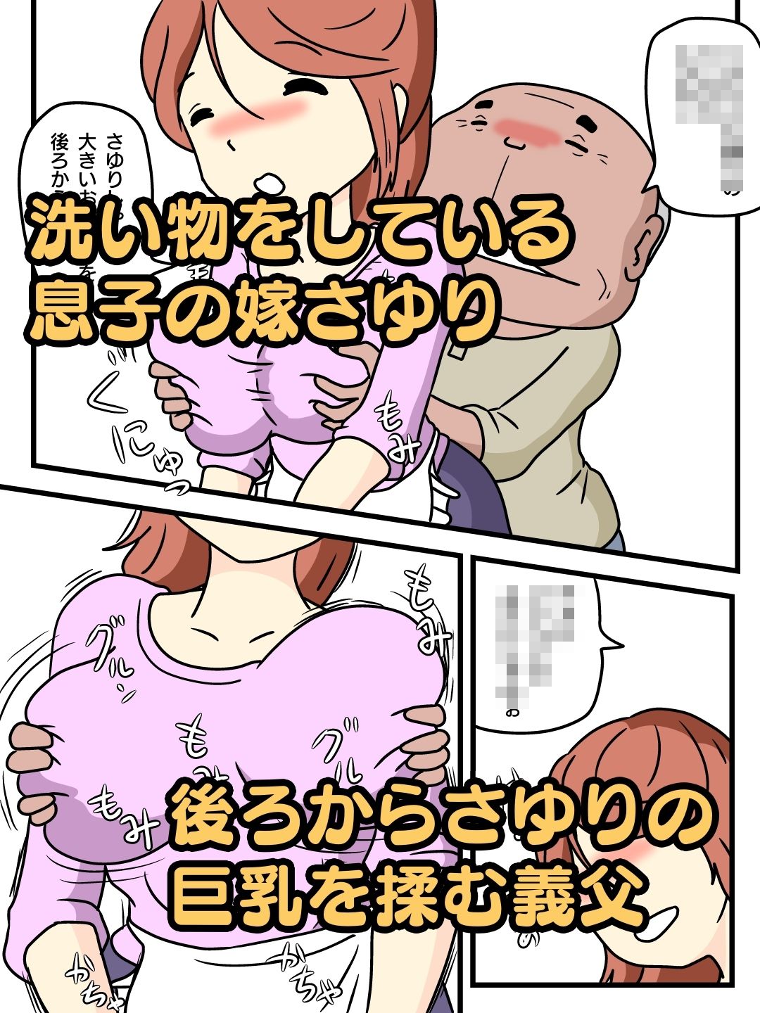 そこに義父が現れ後ろからさゆりのおっぱいを揉む。