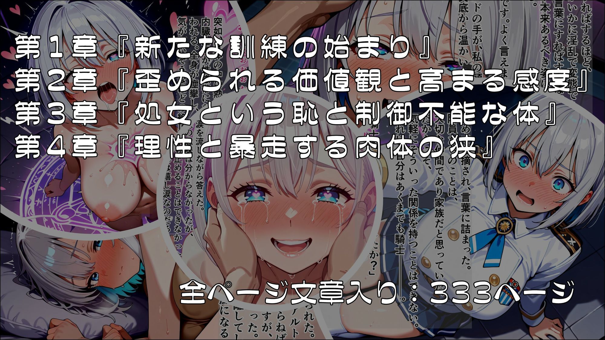 日を追うごとに敏感になっていく肉体、歪められていく価値観、そして処女であることへの恥辱感。剣を握るだけで絶頂し、馬に乗るだけで快感に溺れるようになってしまう。