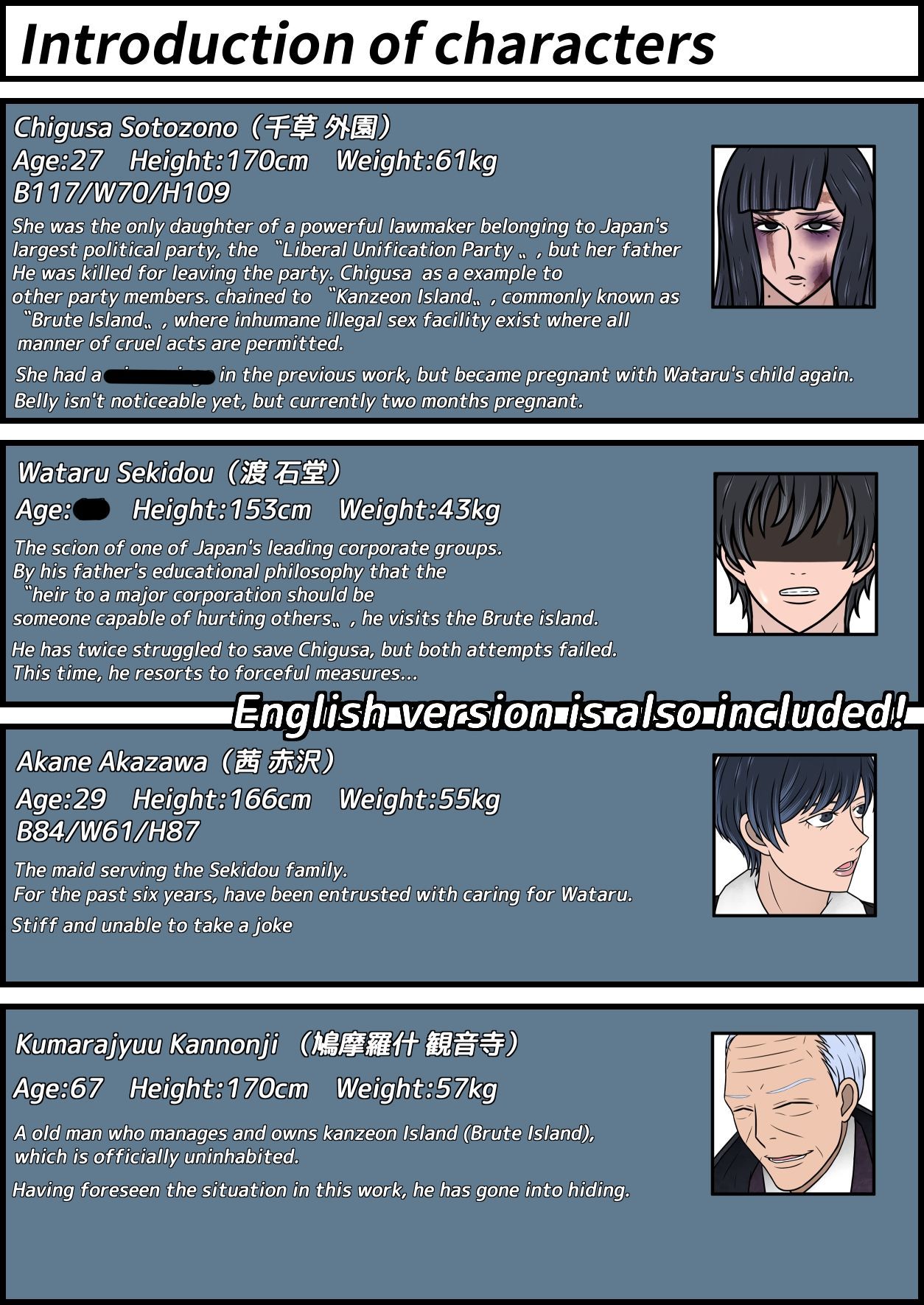 A paradise for the powerful where every inhumane act from human trafficking and mutilation to outright murder is permitted… The isolated island in the open sea, ‘Kanzeon Island,’ commonly known as ‘Brute Island.’ To rescue his beloved imprisoned on this island, the boy takes up arms and rises up.