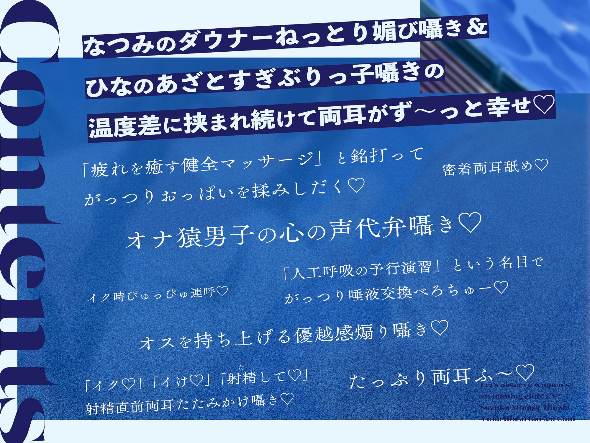 次の日、またもや興奮に歯止めがかからず、勃起おちんちんの腰へこを他の水泳部員に見せつけようとするあなたを、なつみとひなは女子更衣室に連れこみ、耳舐め手コキで気持ちよ〜くぴゅっぴゅっぴゅ〜させてくれます♪