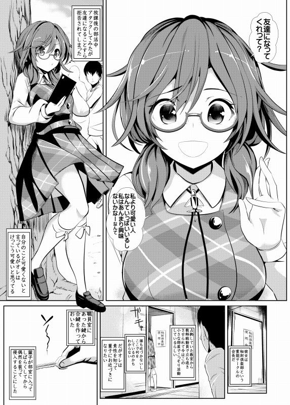 部室に鍵を閉めて寝てる少女、しかし合鍵で部室を開けられその無防備な状態の姿をクラスの男子に見つけられてしまう。男子に卑猥な写真を撮られ、体を堪能され弄られていく…。暗がりで静かな部室で、普段の声とは異なる高オクターブの喘ぎ声と、お互いの性器同士が激しく・優しく擦りあい・ねちっこく接吻する音が静かに部室に響きわたる…