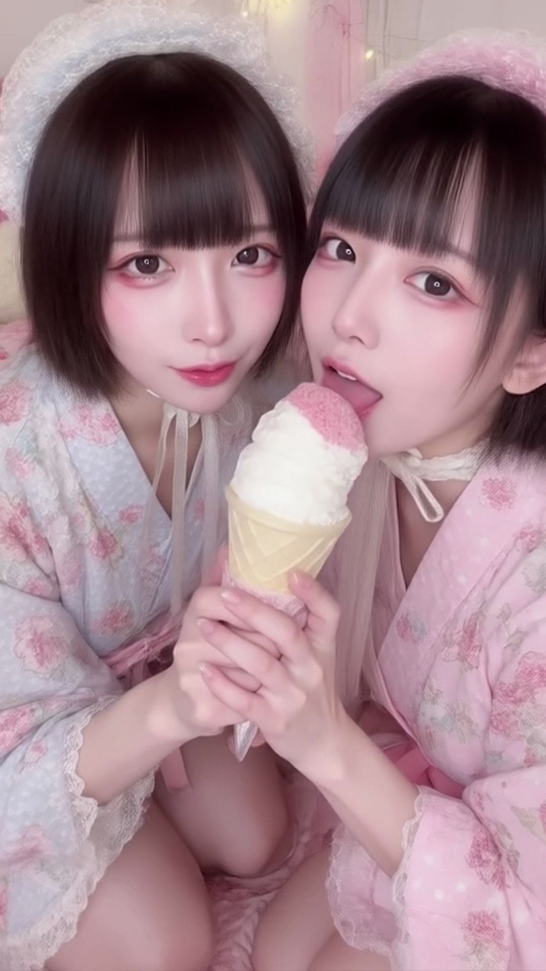 1本のアイスクリームを、ふたりの女の子が左右からゆっくりと舐め合う――