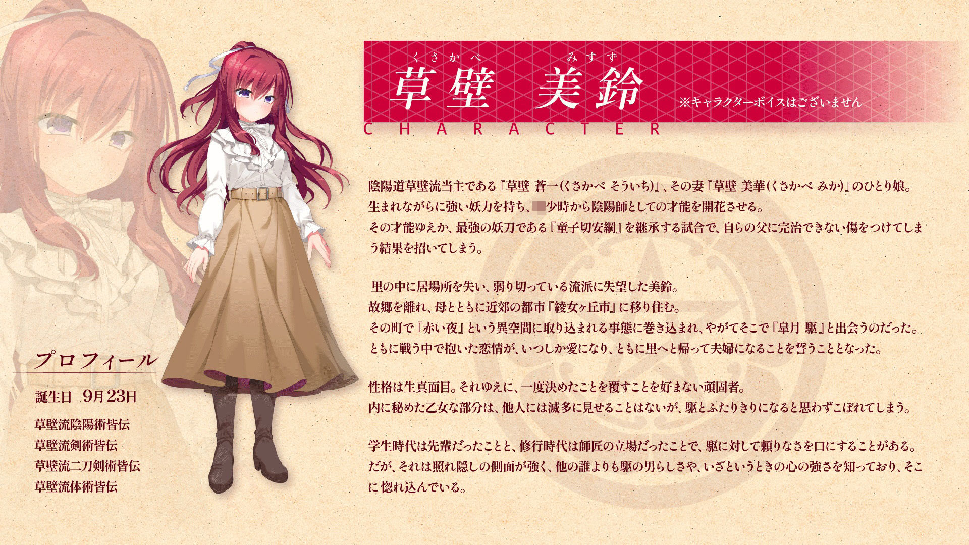 陰陽道草壁流当主である『草壁 蒼一(くさかべ そういち)』、その妻『草壁 美華(くさかべ みか)』のひとり娘。