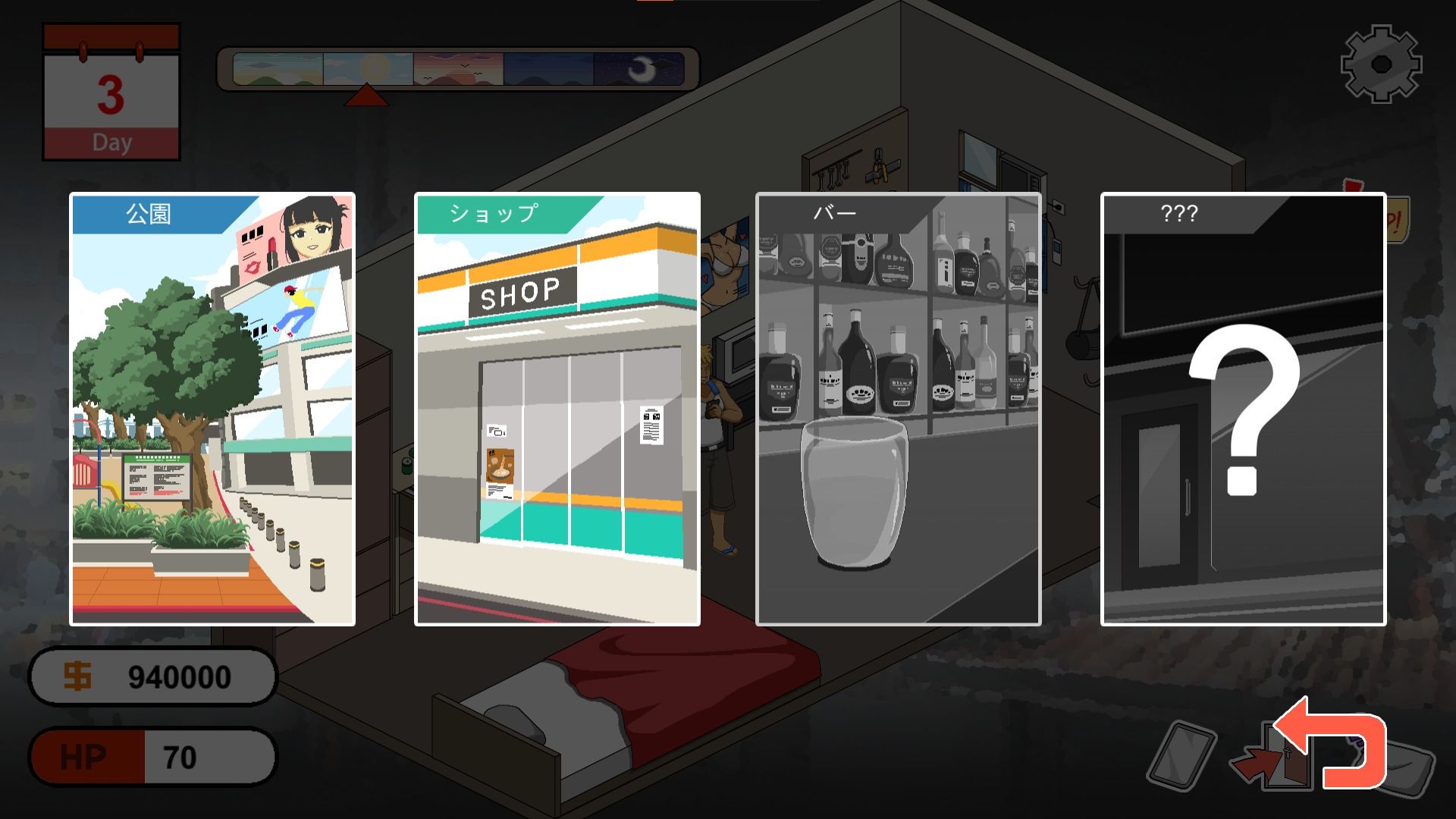 ゲーム内では日数や時間に制限があり、仕事に励む、買い物に出かける、休むなど、その日の行動を自由に選択可能です。