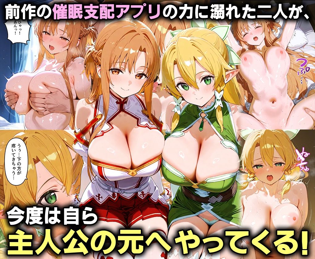 主人公はすでにSAOのヒロインを支配下に置き、欲望のままにVRハーレムを堪能する少年。前作でアプリの力に溺れた明日奈とリーファが、今度は自ら主人公の元へやってくる!「我慢できなかった…(はーと)」と懇願する明日奈とリーファのスレンダーボディを好き放題!ぷるっと美乳に埋もれ、びちょびちょのおまんこにガン突きピストンが止まらず大量中出し!バニー、水着、緊縛、ウェディングドレスでコスプレがエスカレートし、二人をオナホ扱いして金玉空っぽになるまでヤリまくる!