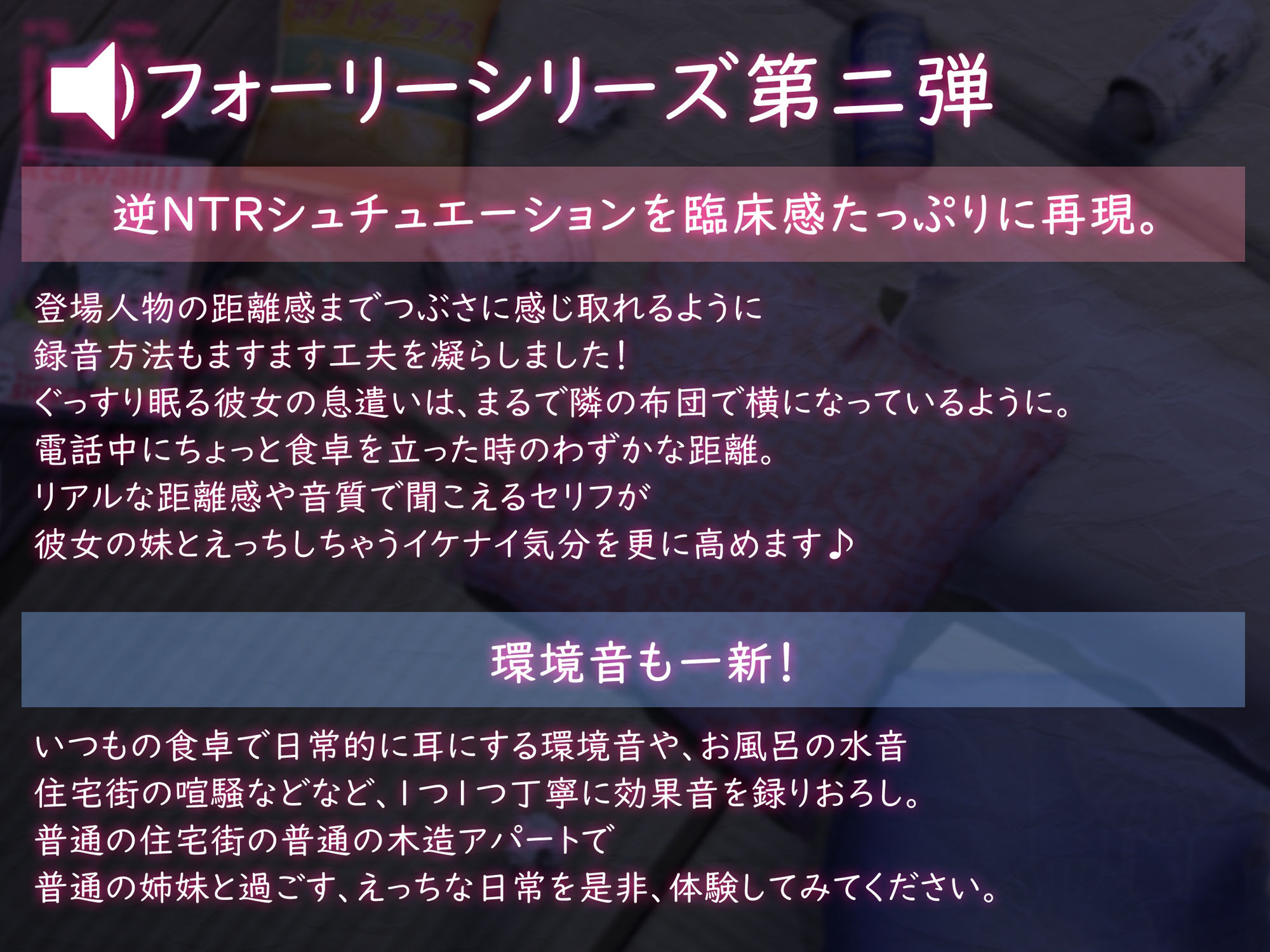 まるで目をつぶるとその場で起こっているかのような、リアルすぎるサウンド版VRで、「禁断の行為」のスリルを心ゆくまでご堪能ください。