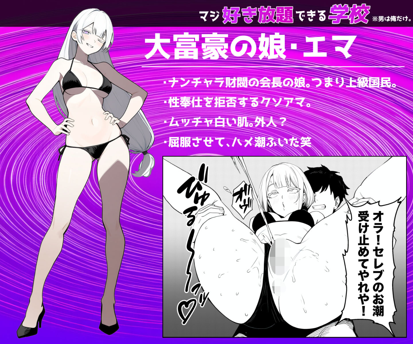 水泳の授業で好き勝手するためにプールサイドに移動。スク水から覗く日焼けがとびきりシコい、日焼けマンコの紬ちゃんを見つける(聞いたらなんと処女!)。彼女の乳首を舐めつつ、何か足りない気がしたら、デッキチェアでくつろぐビキニ姿の白マン・エマが目に入る。性奉仕の義務を拒否するエマは、時価総額百兆円に達する財閥の会長の娘らしい。当然成敗してやることに!白マンと黒マンのコントラストのシコさ!醜い性欲をサンドイッチ・アナル舐めフェラや、顔面潮吹きレズぶっかけの形で実現しながら、種付け作業で俺は少子化対策に貢献することになる!